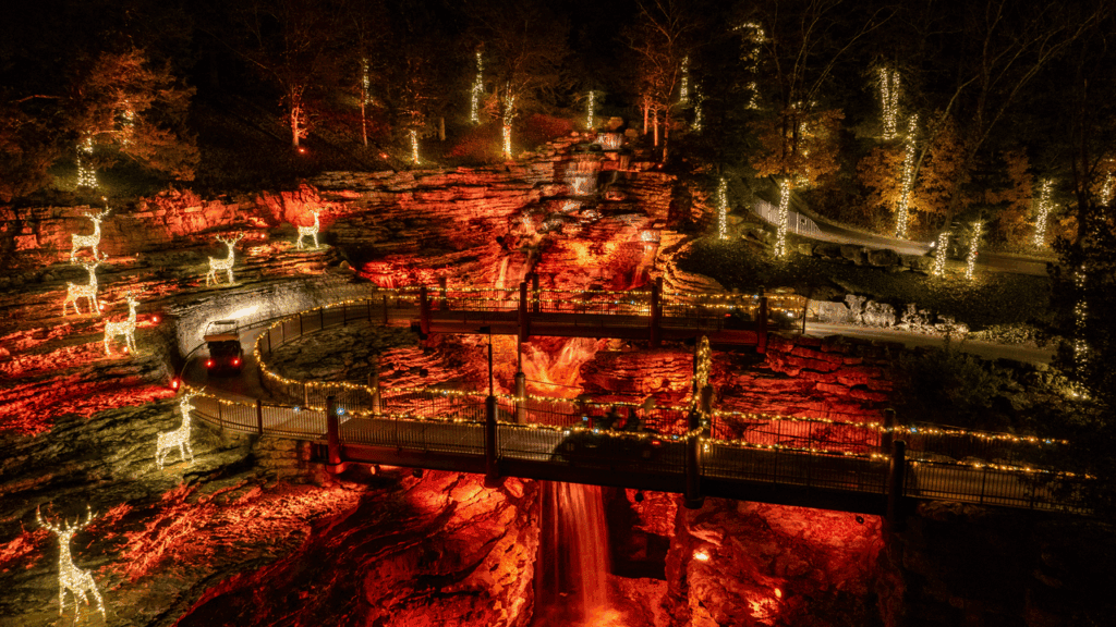 Among the most iconic elements are the glowing howling wolves, leaping reindeer and other animals that roam the Ozarks nestled among the cliffs and trees of the Lost Canyon Trail, an unforgettable blend of nature, artistry and holiday magic. Inside the cave, the one-of-a-kind Bat Bar welcomes guests with warm drinks, panoramic views of illuminated cavern walls and a breathtaking waterfall.